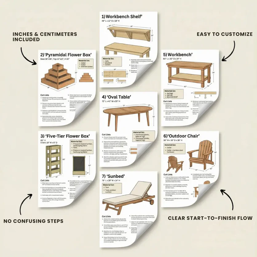 🧰 100+ Ready-to-Build Projects 📘 500+ Pages of Pro Instructions 📏 Inches + Centimeters Included 🏡 Projects for Home, Garden & Workshop 👍 Beginner-Friendly and Easy to Follow ✂️ Accurate Cutting Lists Included 🖼️ HD Step-by-Step Visuals 👷 Great for Hobbyists and Skilled Builders