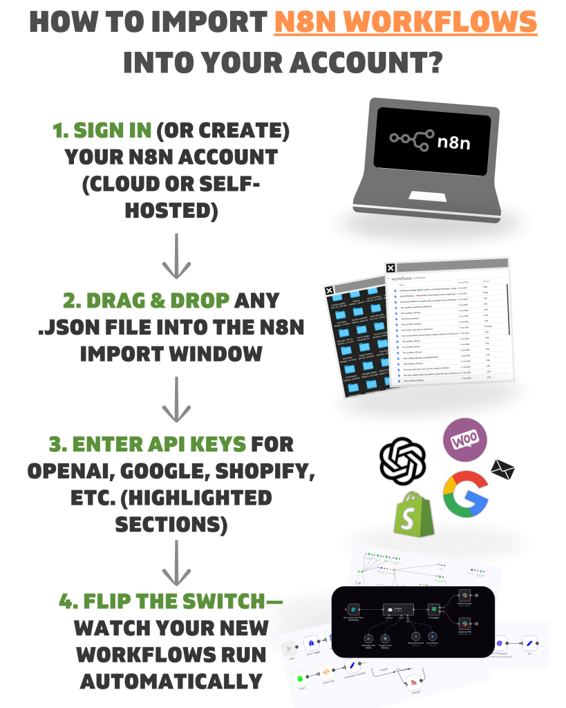 Over 1,200 creators, marketers, and developers already use our automation-ready n8n workflows — no more wasting hours building from scratch or debugging broken logic. — Just clean, high-impact, plug-and-play workflows for CRM, email, social media, AI, and more — fully tested and ready to launch.